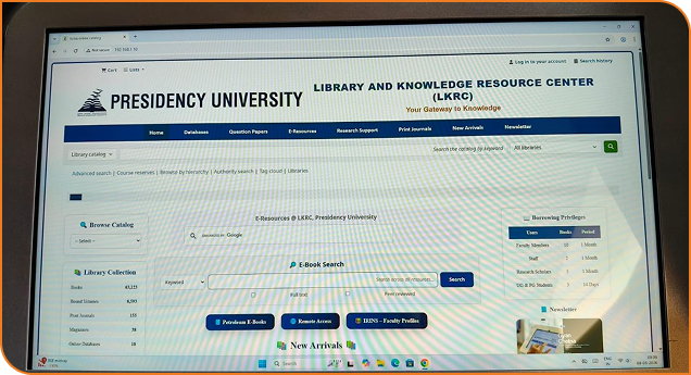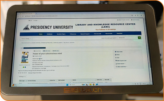 Library and Knowledge Resource Center (LKRC) at Presidency University has recently implemented three new Digital Kiosk Interfaces across all three Libraries: the Engineering Library, Law Library, and Management Library. These kiosks are now fully operational and are conveniently placed near the circulation areas of each Library. All Library users are encouraged to make use of these facilities to access Library resources and services more efficiently.